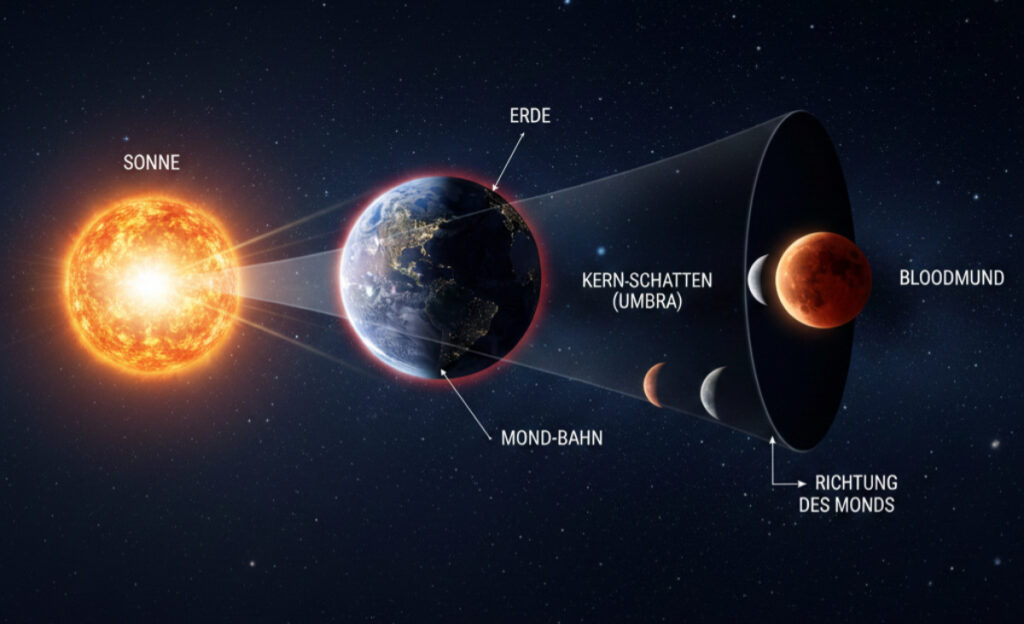- Der Mond wird daher nur von diesem gefilterten, roten Licht beleuchtet, was ihm die charakteristische „Blutmond“-Färbung verleiht.