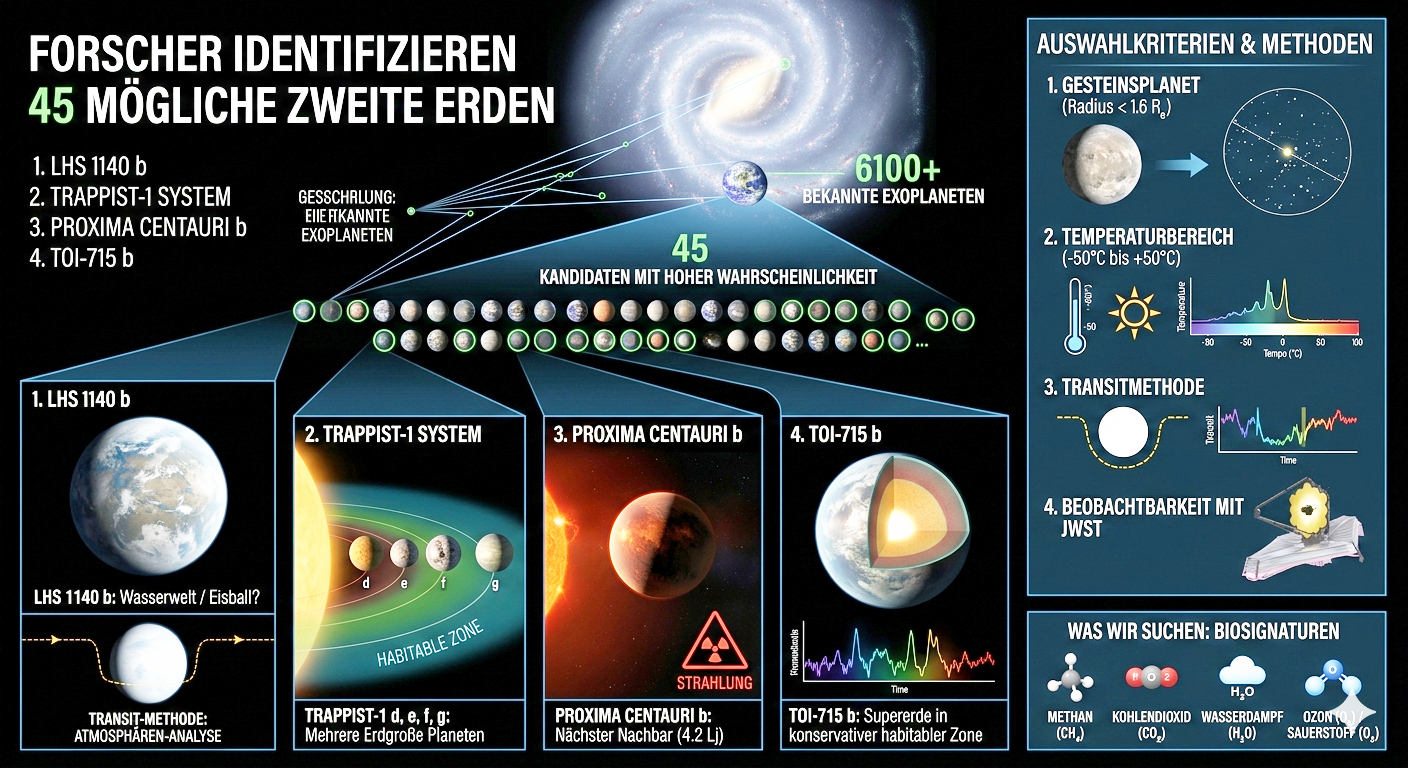 Wissenschaftler vom Carl Sagan Institute an der Cornell University unter der Leitung der Astrophysikerin Lisa Kaltenegger haben aus der riesigen Anzahl von über 6100 bekannten Exoplaneten eine exklusive Gruppe von 45 Himmelskörpern herausgefiltert. Diese Auswahl basiert auf der Erkenntnis, dass nicht jeder Planet, der einen fernen Stern umkreist, auch tatsächlich lebensfreundliche Bedingungen bieten kann. Die Forscher konzentrierten sich bei ihrer Suche primär auf Gesteinsplaneten, da eine feste Oberfläche als Grundvoraussetzung für die Entstehung von Leben gilt. Ein entscheidendes Kriterium für die Aufnahme in diese Liste ist die Lage des Planeten innerhalb der habitablen Zone seines Muttersterns. In diesem Bereich sind die Temperaturen moderat genug, damit Wasser dauerhaft in flüssiger Form auf der Oberfläche existieren kann. Flüssiges Wasser fungiert in der Biologie als universelles Lösungsmittel und ist für chemische Prozesse essenziell. Die Identifizierung dieser 45 Kandidaten ist ein wichtiger Meilenstein, da sie die astronomische Suche nach außerirdischem Leben präziser und effizienter macht. Anstatt wahllos Milliarden von Sternen zu scannen, können sich die Teleskope nun auf diese vielversprechenden Ziele konzentrieren. Besonders wichtig ist dabei die Beobachtbarkeit der Planeten von der Erde oder aus dem Weltraum heraus durch moderne Instrumente. Viele der ausgewählten Welten befinden sich in einer geometrischen Position, die eine genaue Analyse ihrer Atmosphäre ermöglicht. Wenn ein Planet von uns aus gesehen direkt vor seinem Stern vorbeizieht, filtert seine Atmosphäre das Sternenlicht auf charakteristische Weise. Diese winzigen Veränderungen im Lichtspektrum verraten den Forschern schließlich, welche Gase in der fernen Lufthülle vorhanden sind. Die Wissenschaftler suchen dabei gezielt nach sogenannten Biosignaturen, also chemischen Fingerabdrücken von biologischem Leben. Zu diesen Indikatoren gehören Gase wie Sauerstoff, Ozon, Methan und Distickstoffmonoxid in bestimmten Konzentrationen. Einige der identifizierten Welten gehören zu bekannten Systemen wie TRAPPIST-1, das gleich mehrere erdähnliche Planeten beherbergt. Auch der Planet Proxima Centauri b, der unseren nächsten Nachbarstern im All umkreist, ist Teil dieser wichtigen Auswahl. Die Forscher nutzten für ihre umfassende Analyse modernste Daten der Gaia-Mission sowie komplexe Klimamodelle. Diese Modelle berechnen unter anderem, wie eine mögliche Wolkendecke die Temperaturen auf einem Planeten beeinflussen könnte. Es stellte sich heraus, dass 24 dieser Planeten in einer besonders stabilen Klimazone liegen, die über Milliarden von Jahren hinweg lebensfreundlich geblieben sein könnte. Langfristige Stabilität ist wichtig, damit sich komplexere Lebensformen überhaupt über lange Zeiträume entwickeln können. Die Distanz zu diesen Planeten beträgt oft nur wenige Dutzend Lichtjahre, was sie für heutige Messgeräte erreichbar macht. Das James-Webb-Weltraumteleskop spielt bei der detaillierten Untersuchung dieser Kandidaten eine absolut zentrale Rolle. Es kann Infrarotstrahlung auffangen, die Informationen über die Temperatur und Zusammensetzung der Planetenoberflächen liefert. Trotz der Bezeichnung als mögliche zweite Erden ist bisher noch auf keinem dieser Himmelskörper tatsächlich Leben nachgewiesen worden. Die Liste dient vielmehr als eine Art Prioritätenkatalog für die kommenden Jahrzehnte der internationalen Weltraumforschung. Es ist möglich, dass viele dieser Planeten trotz ihrer guten Lage keine schützende Atmosphäre mehr besitzen. Ohne ein Magnetfeld könnten sie durch die harte Strahlung ihrer Sonnen kahlgefegt worden sein. Dennoch erhöht die Eingrenzung auf diese Top-Kandidaten die statistische Wahrscheinlichkeit für einen baldigen wissenschaftlichen Durchbruch enorm. Die Entdeckung von Leben außerhalb unseres Sonnensystems würde unser Verständnis vom Platz der Menschheit im Universum fundamental verändern. Wir stehen nun an einem Punkt, an dem die Technologie endlich weit genug fortgeschritten ist, um die Frage nach der Einsamkeit im All wissenschaftlich zu klären. Jede neue Beobachtung bringt uns der Gewissheit näher, ob die Erde ein einzigartiger Zufall oder Teil eines belebten Kosmos ist. Die Astronomie hat mit dieser Auswahl ein klares Ziel definiert, auf das zukünftige Generationen von Forschern hinarbeiten werden. Es bleibt abzuwarten, welcher dieser fernen Orte sich am Ende als tatsächlich bewohnbar erweist. Die Zusammenarbeit zwischen Theorie und Beobachtung ist der Schlüssel zum Erfolg dieser ehrgeizigen Suche. Jede Analyse einer Atmosphäre liefert uns neue Puzzleteile über die Vielfalt der Planeten in unserer Galaxie. Letztlich geht es darum, die Bedingungen zu verstehen, die unseren eigenen Planeten so besonders machen. Die Wissenschaftler hoffen, schon in den nächsten Jahren erste konkrete Daten über die chemische Zusammensetzung dieser Welten zu erhalten. Diese 45 Planeten sind nun unsere besten Hoffnungsträger bei der Suche nach einer Antwort auf die Frage, ob wir allein sind.